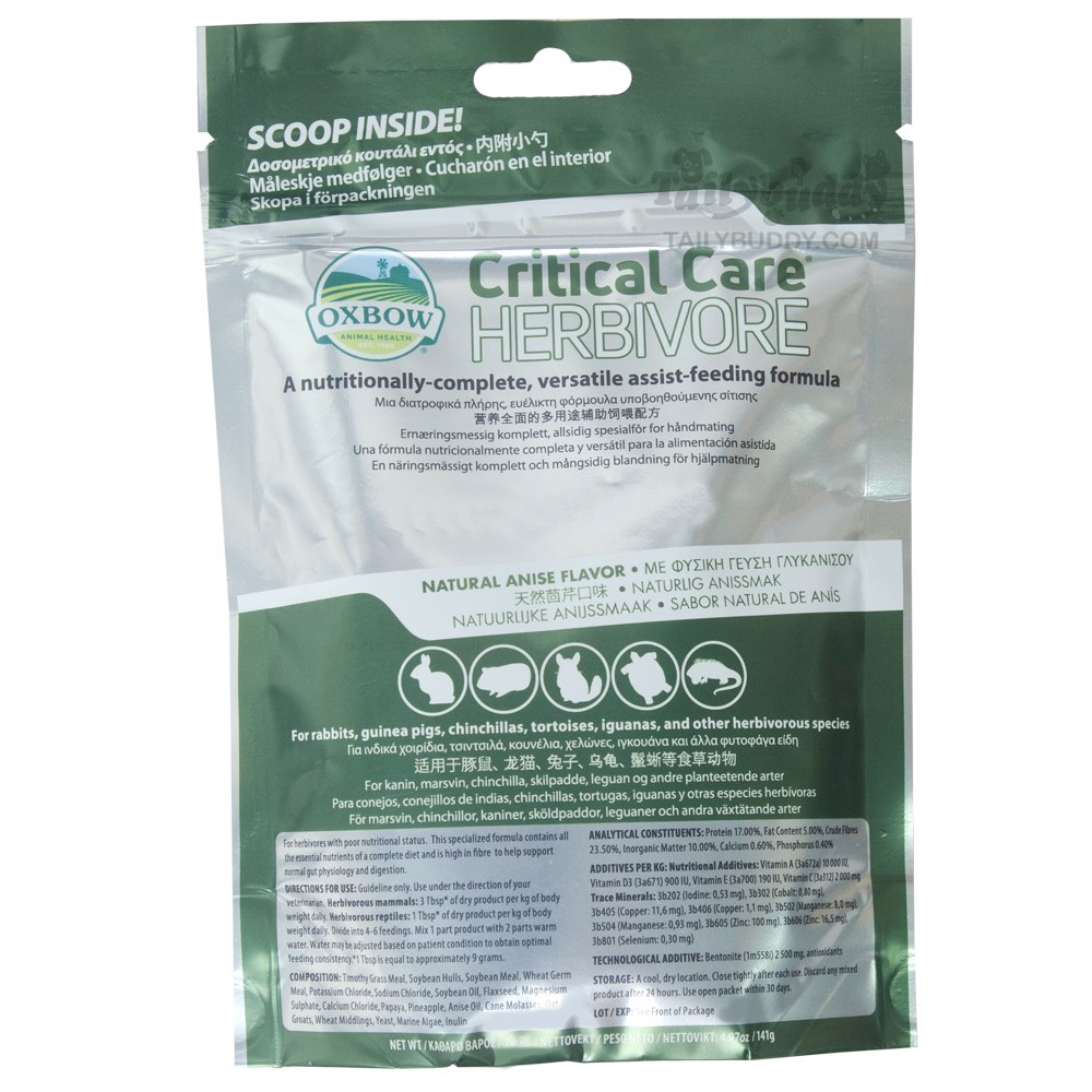 Shake well before using. Mix 1 part Critical Care® with 2 parts warm water to the desired consistency. The volume of water may be adjusted depending on feeding method. Herbivorous mammals: Mix 3 Tbsp per kg of body weight daily. (1 Tbsp is equal to approximately 9 grams.) Herbivorous reptiles: Mix 1 Tbsp per kg of body weight daily. Amounts are general guidelines. Divide into 4 to 6 feedings unless specified by your veterinarian. Water should be available to the animal at all times. Prepare fresh at each feeding; discard after 24 hours. Store in a cool, dry place.