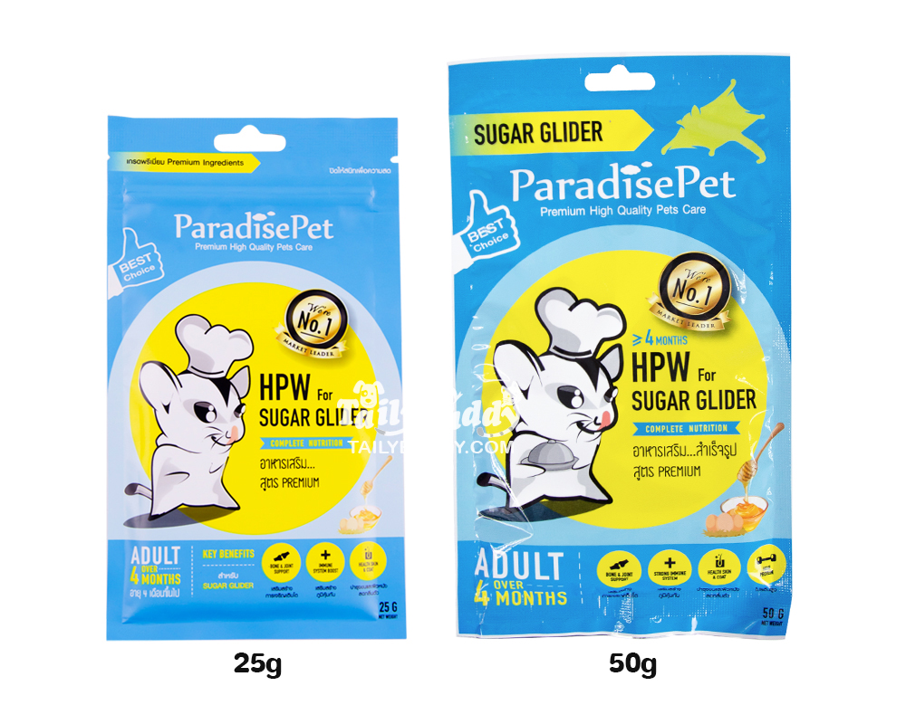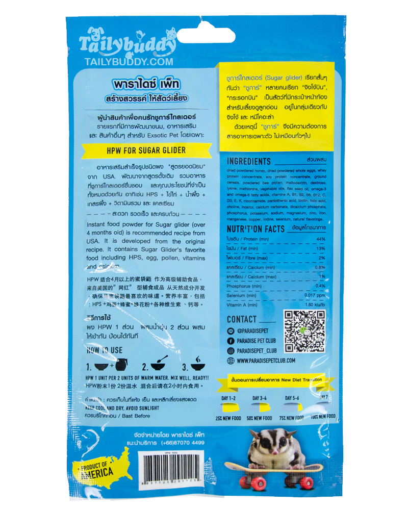 รวมอาหารที่ชูการ์ไกลเดอร์ชื่นชอบ โดยมีส่วนผสม HPS + ไข่ไก่ + น้ำผึ้ง + เกสรผึ้ง + วิตามินรวม และแคลเซียม