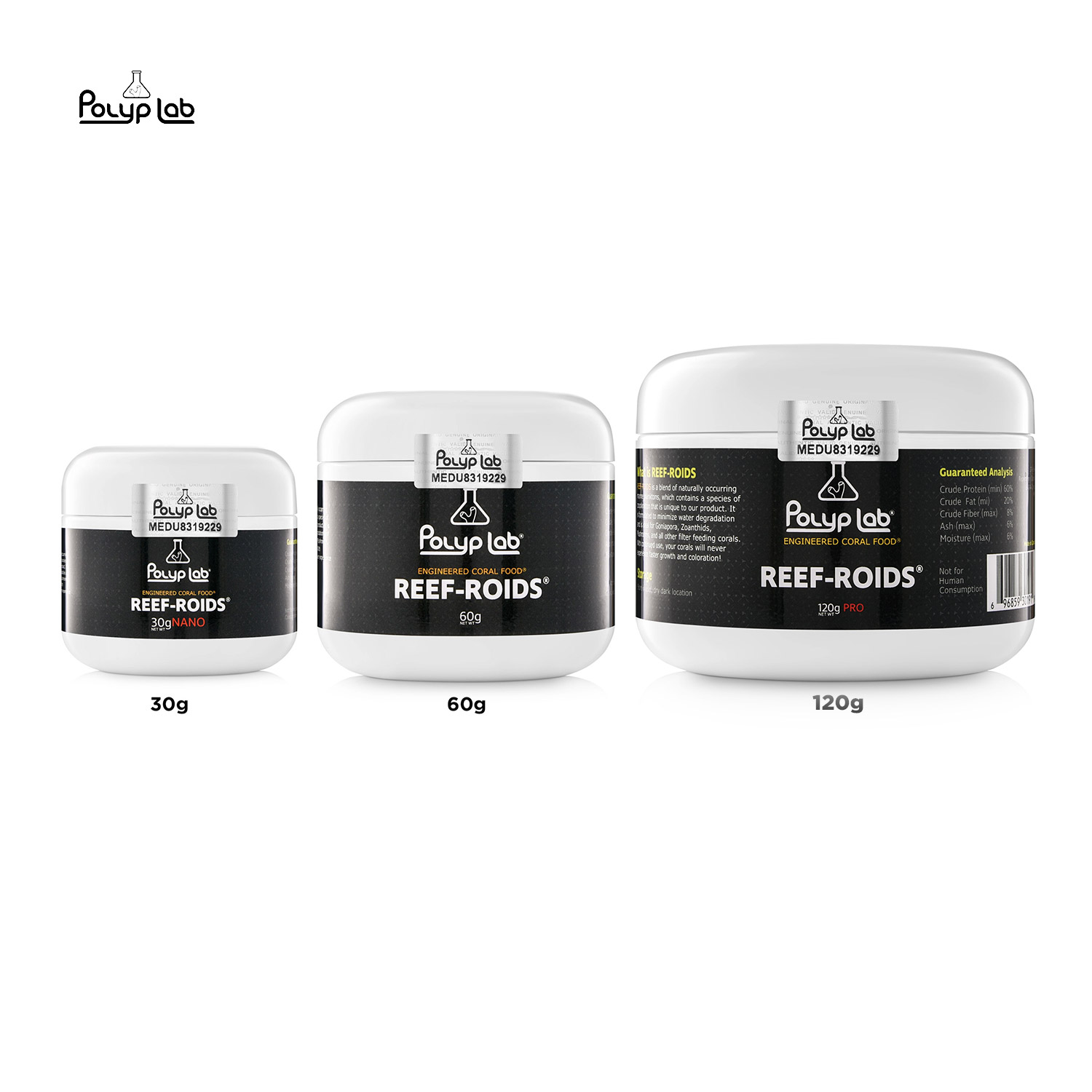 Reef-Roids เป็นอาหารปะการัง (Zooplankton) จากธรรมชาติ สูตรเฉพาะของ Polyp Lab ใช้กับ หินแดง หินเขียว (Goniapora), กระดุม (Zoanthids), เห็ด (Mushrooms) หรือ ปะการังชนิดอื่นๆ ที่ต้องการป้อนอาหาร ถ้าให้อย่างต่อเนื่อง จะทำให้ปะการังโตอย่างรวดเร็ว และสีสันสดใส