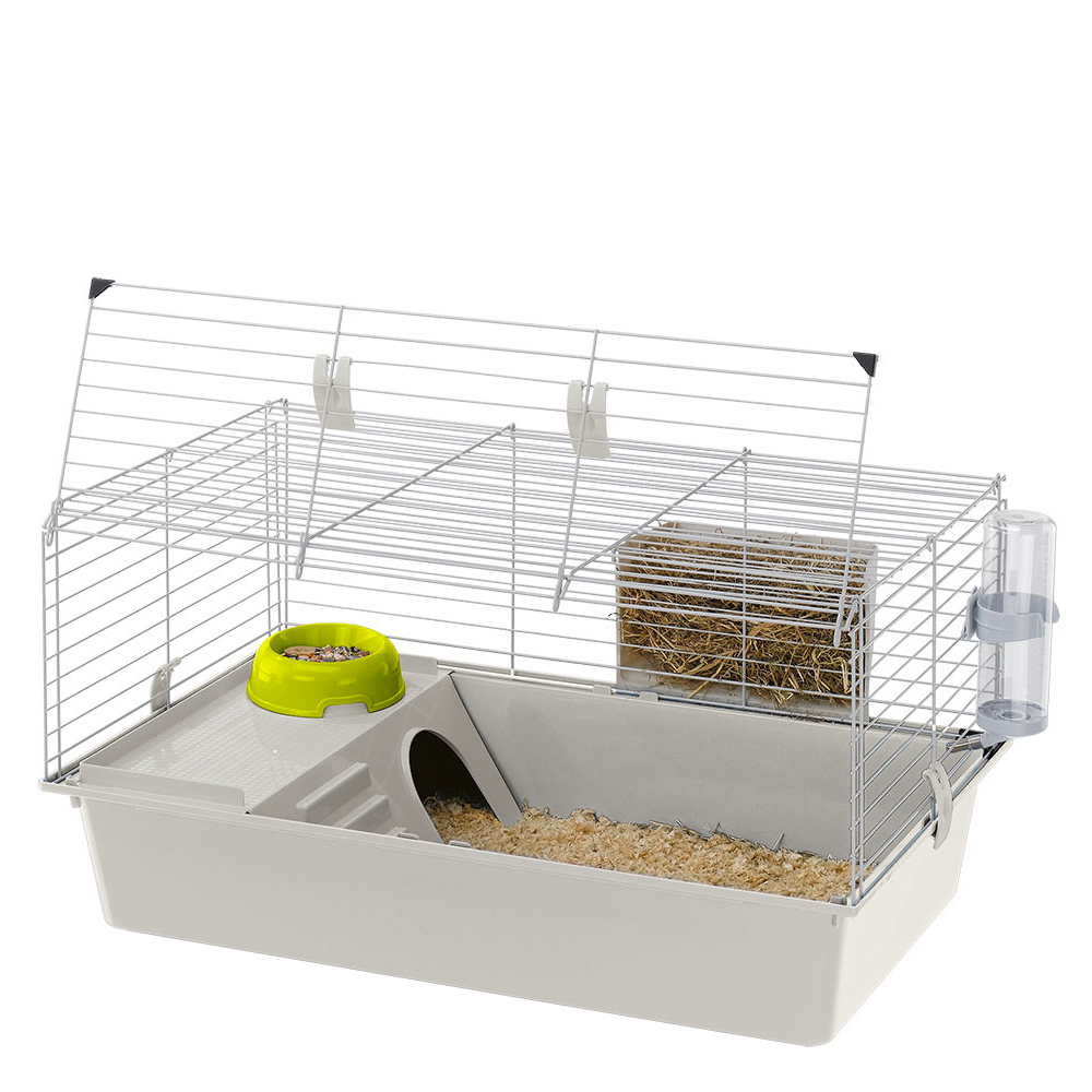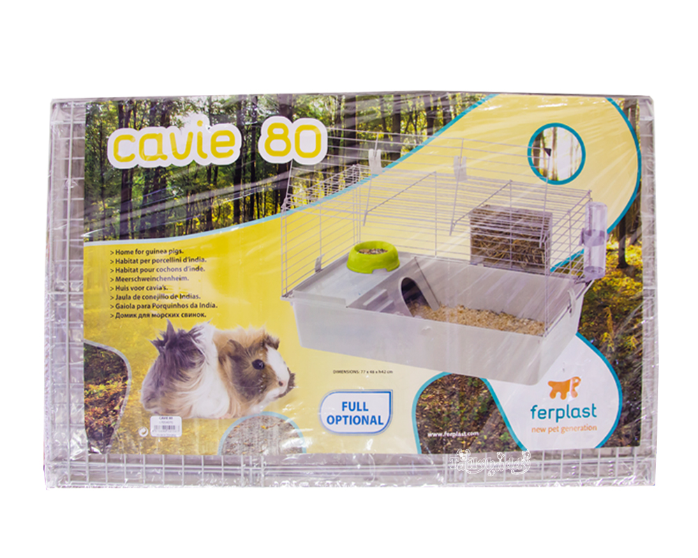 Cavie 80 is a guinea pig cage with recently designed opening and closing fasteners to ensure your pet greater safety. The habitat features a large plastic base with a varnished wire mesh structure. Inside, you will find a comfortable little house for guinea-pigs, a drinking bottle and a plastic feeder. Cavie 80 is easy to take care of and clean and has a door that can be opened completely. When needed, the base can be fully detached. Cavie 80 also has the Save Space trademark. It has a metal stand with wheels, which is available as an optional. If you are interested in a more original and colourful version, Cavie 80 Decor may be what you are looking for.